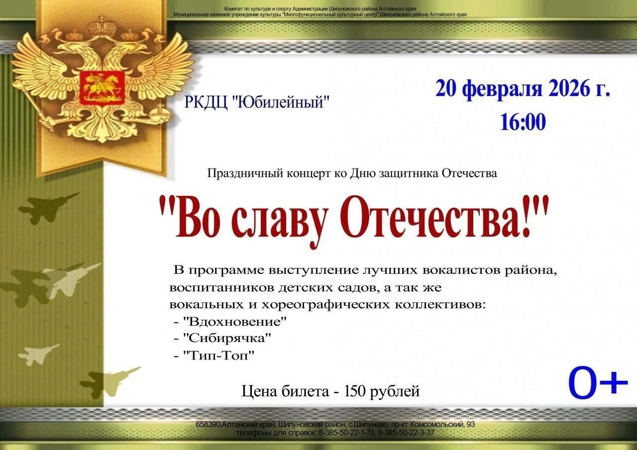 РКДЦ "Юбилейный" 20 февраля 2026 г. 16:00 Праздничный концерт ко Дню защитника Отечества "Во славу Отечества!" В программе выступление лучших вокалистов района, воспитанников детских садов, а так же вокальных и хореографических коллективов: "Вдохновение" - "Сибирячка" - "Тип-Топ" Цена билета 150 рублей 0+ 658380 Алтайский край. Шипуновский район, Шипуново, проспект Комсомольский 93